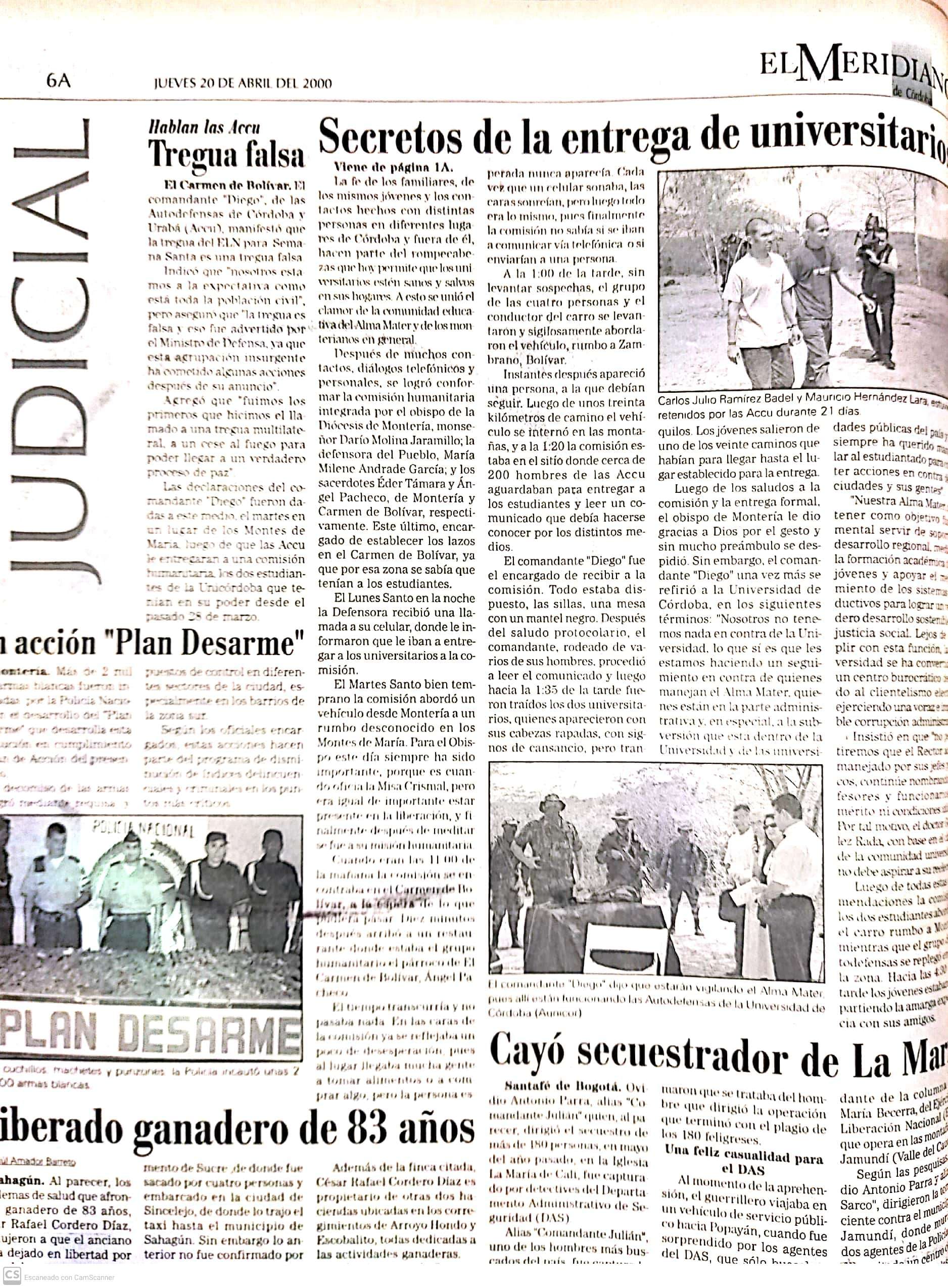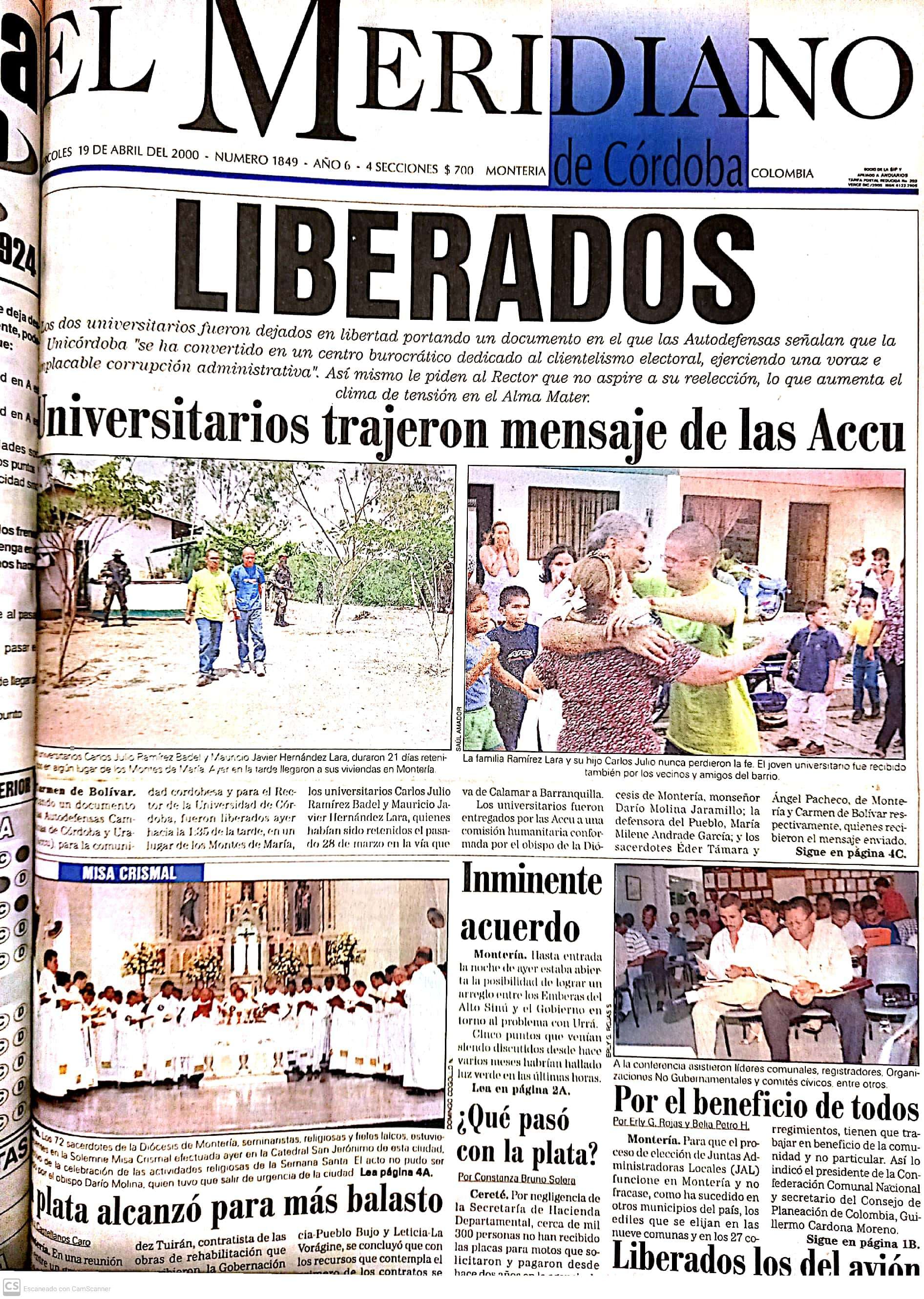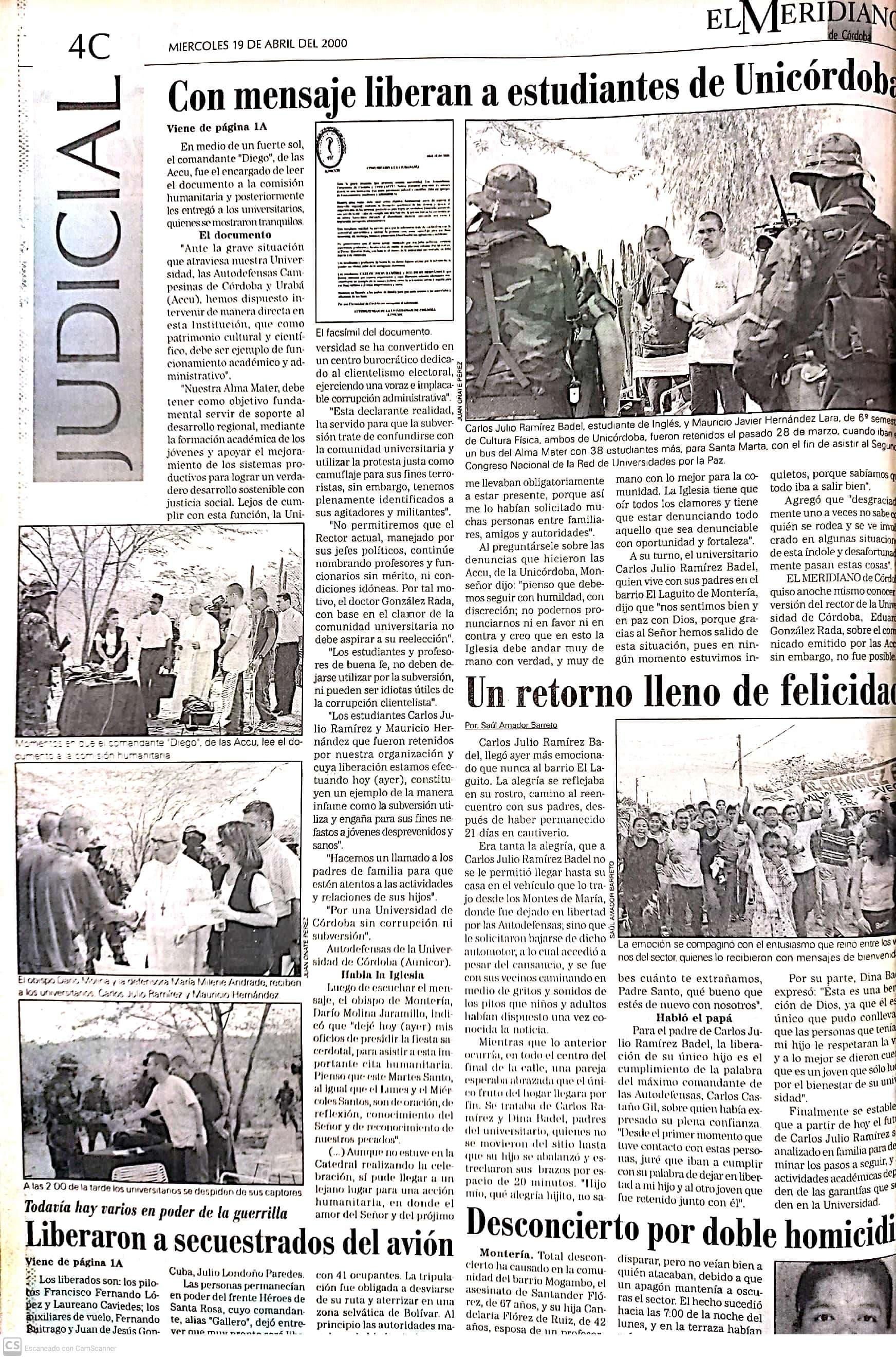 Liberación de los dos estudiantes secuestrados y publicación de una carta escrita por las Autodefensas Unidas de Colombia, AUC, (paramilitares)
