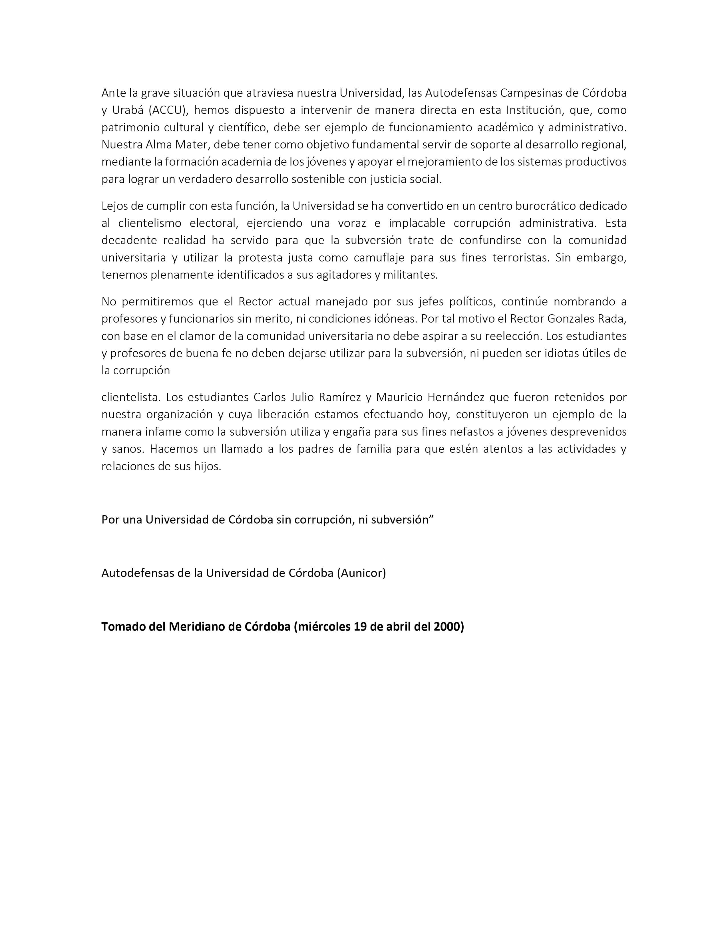 Una vez son liberados los dos estudiantes secuestrados, Carlos Julio Ramírez y Mauricio Javier Hernández, las AUC, paramilitares, envían un comunicado en el que anuncian la toma de la Universidad de Córdoba. El documento aparece firmado por las "Autodefensas de la Universidad de Córdoba, AUNICOR".