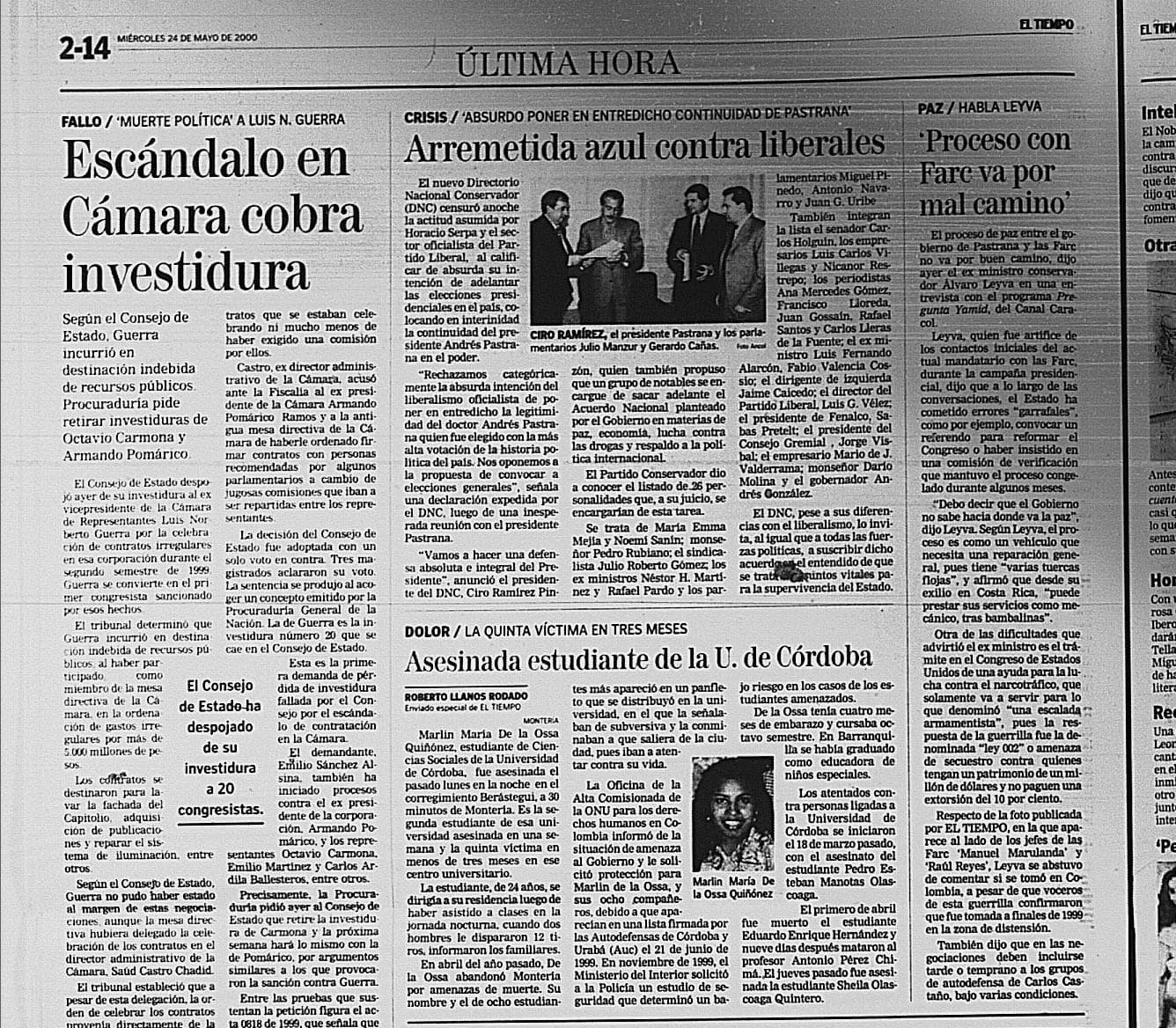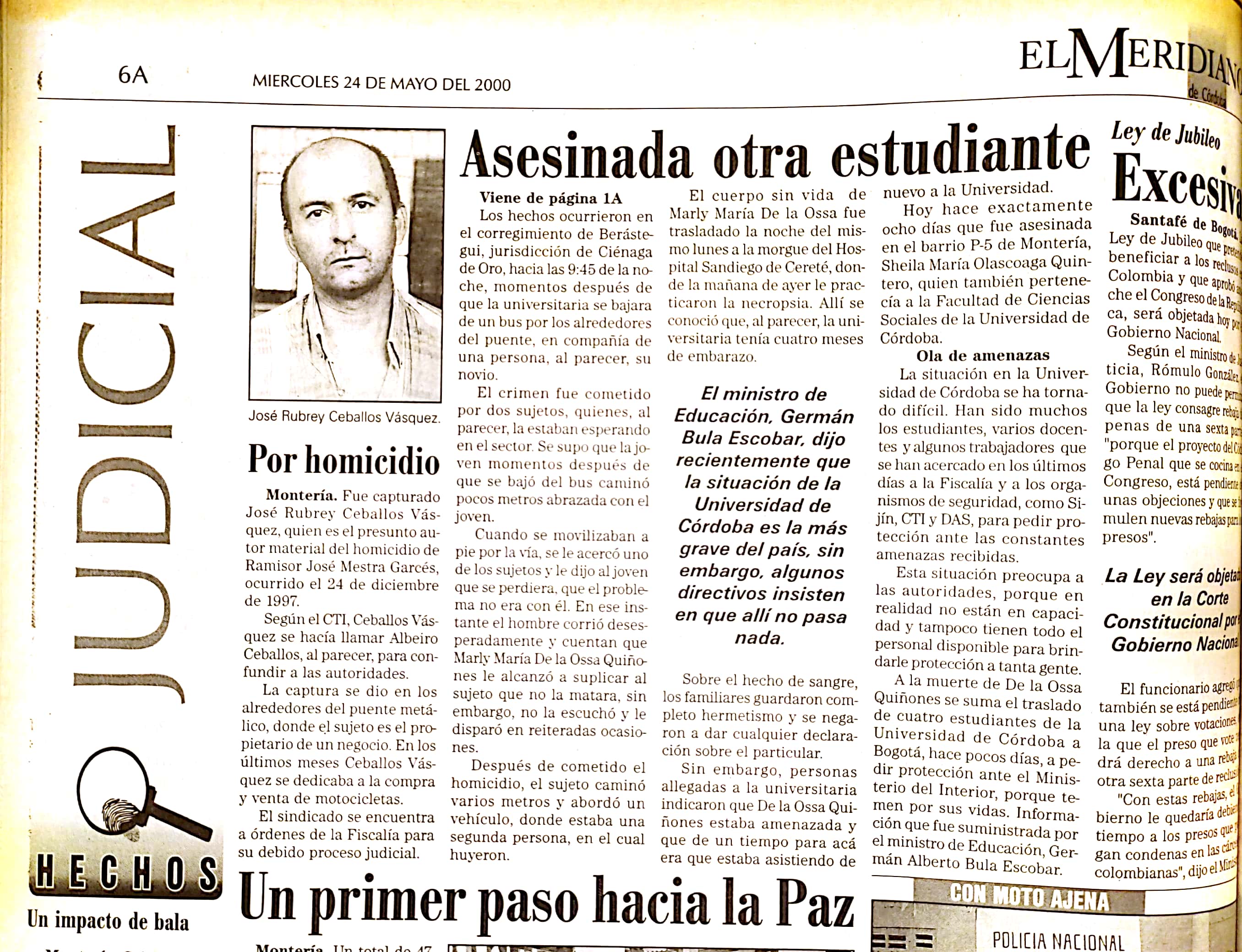 Asesinato de Marlys de la Ossa Quiñónez, estudiante de Ciencias Sociales quien se encontraba embarazada cuando la mataron. Meses antes del asesinato, el nombre de Marlys había aparecido en un panfleto donde amenazaban a los estudiantes acusándolos de subversivos.