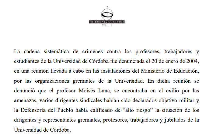 Con el exilio del profesor de la Universidad de Córdoba, Moisés Luna, comienzan las denuncias públicas de los sindicatos de la institución en contra de los paramilitares. Varios dirigentes sindicales fueron declarados objetivos militares por las Autodefensas y la Defensoría del Pueblo calificó de “alto riesgo” la situación de los dirigentes y representantes gremiales, profesores, trabajadores y jubilados de la Universidad.