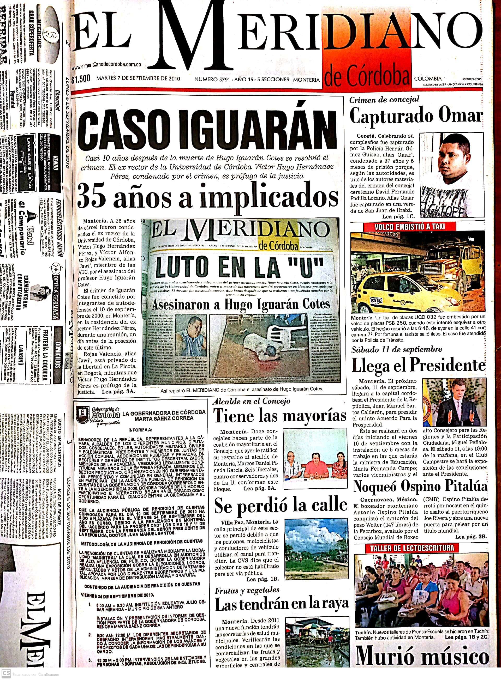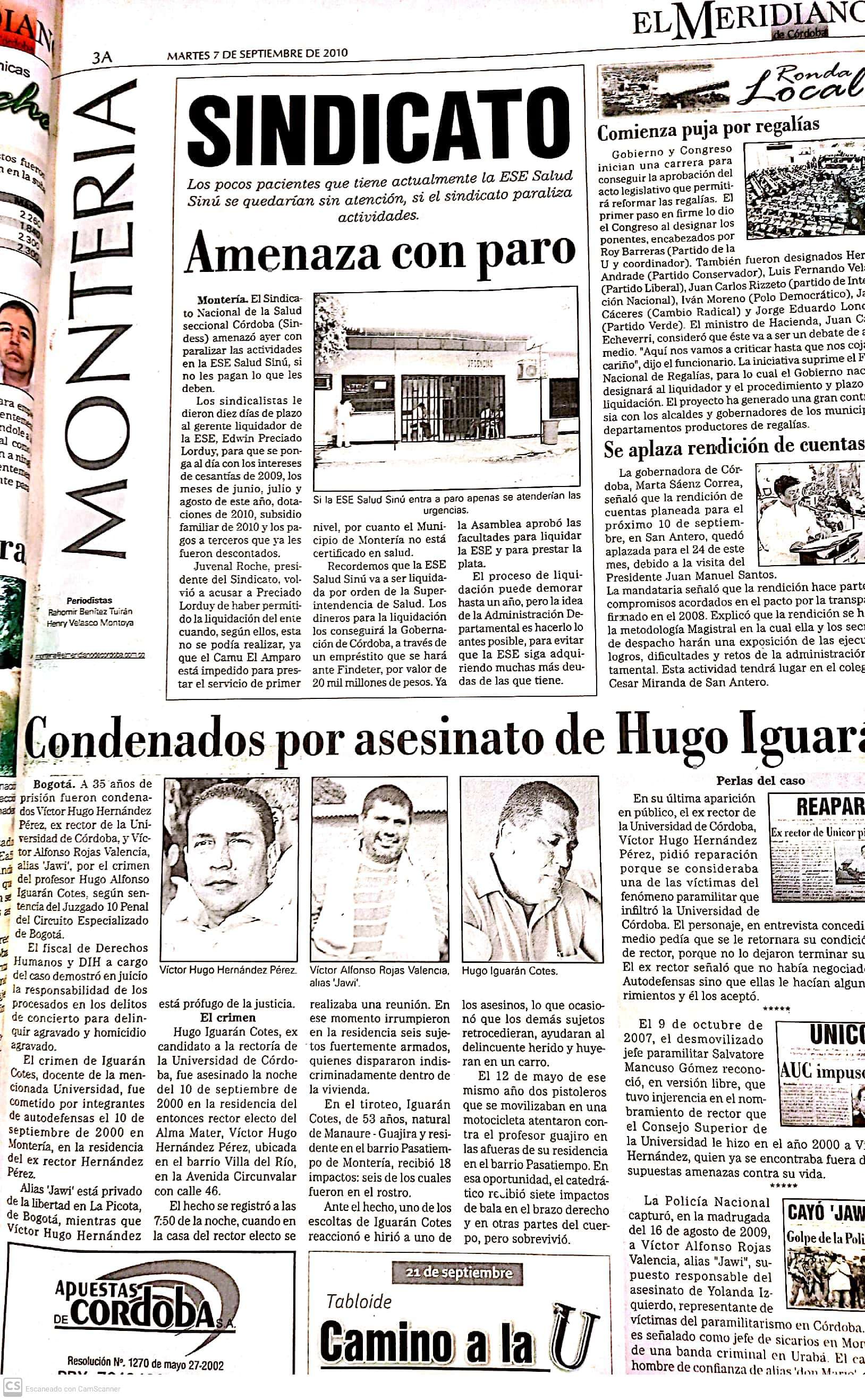 Víctor Hugo Hernández Pérez, quien fuera rector de la Universidad de Córdoba en 2000, fue sentenciado a 35 años de prisión por su participación en el asesinato del profesor Hugo Iguarán Cotes ocurrido el 10 de septiembre de 2000, además de concierto para delinquir con los paramilitares.
